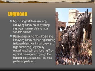 Nang matanaw ng mga Troyano ang kabayong kahoy inisip ng mga ito na sumusuko na sa labanan ang mga Griyego. Nang matanaw ng mga Troyano ang kabayong kahoy inisip ng mga ito na sumusuko na sa labanan ang mga Griyego. Ang Labanan ng Marathon 5 Sinaunang Griyego.