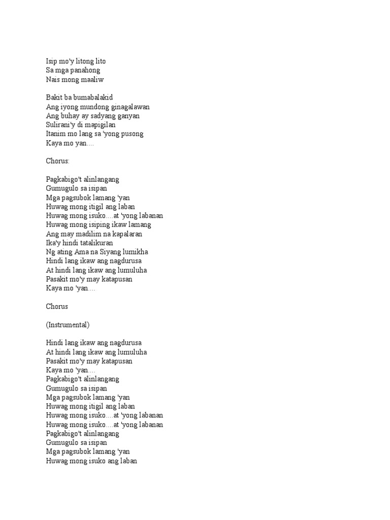 G Am Ang buhay ay sadyang ganyan F C Suliraniy di mapigilan G Am Itanim mo lang sa yong pusong F Kaya mo yan Chorus C G Am Pagkabigot alinlangang F C Gumugulo sa isipan G Am Mga pagsubok lamang yan F C Huwag mong itigil ang laban G Am F Huwag mong isuko at iyong labanan C G Am Huwag mong isiping ikaw lamang F C Ang may madilim na kapalaran G Am. Huwag mong isiping ikaw lamang. Sa mga panahong nais mong maaliw Bakit ba bumabalakid Ang iyong mundong ginagalawan Ang buhay ay sadyang ganyan Suliraniy di mapigilan Itanim mo lang sa yong pusong Kaya mo yan.