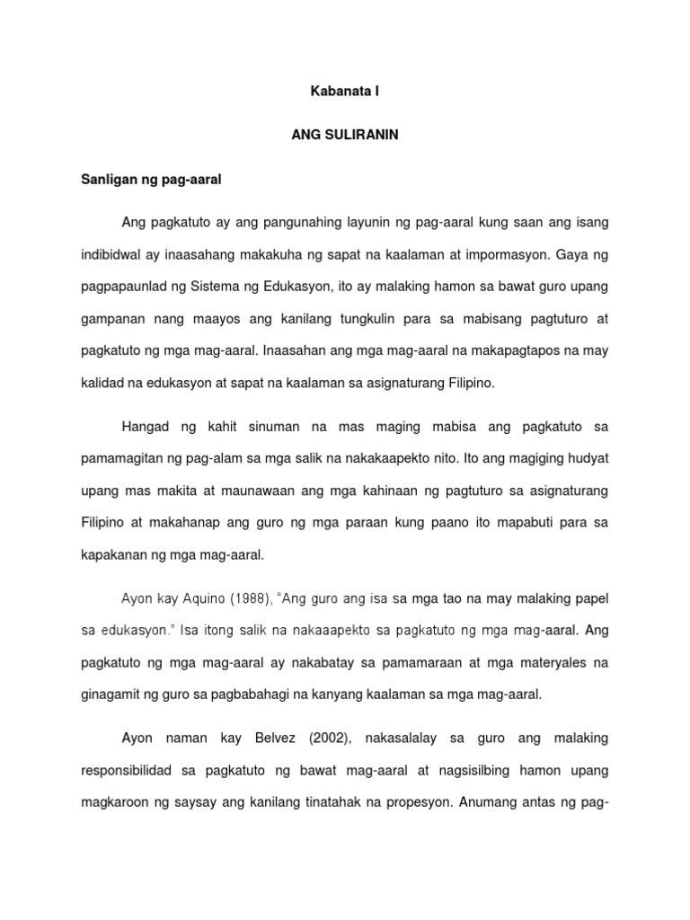Corpuz 2007 may ibat-ibang teorya tungkol sa proseso ng pagkatuto at mga salik na nakakaapekto dito pati na rin mga pamamaraan sa pagtuturo. 1 Banghay at Sandigan ng Pag-aaral 2 Paglalahad ng Suliranin at Ipotesis 3 Kahalagahan ng Pag-aaral 4 Katuturan ng mga Katawagan at 5 Saklaw. Mga Saloobin a t Suliranin ng mg a Mag-Aaral sa Pagkatuto ng Asignaturang Filipino sa Ateneo De Davao High School Jean Lopez-royo.