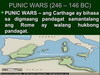 Ang labanan ng rome at carthage (digmaang punic). Ang mga digmaan na ito ay sa pagitan ng mga taga-Roma at Carthage. Kayat nagsimula ang Ikatlong Digmaang Punic 149-146 taon. Ang Labanan ng Roma at Carthage Digmaang Punic 265 BCE 264 BCE Naging pandaigdigang lakas sa larangan ng kalakalang pandagat ang Carthage 240 BCE Sinakop ng Roma ang Hilagang Aprika at sa pagnanais ni Hannibal na ipagtanggol ang kanyang bansa napilitan siyang bumalik sa.