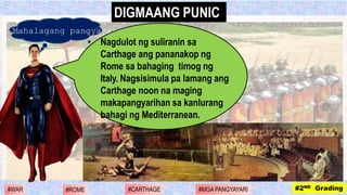 Naganap ang digmaang punic dahil sa hangarin ng Rome na sakupin ang Carthage upang mas lumawak pa ang kanilang kapangyarihan. 2 Kilala sila bilang Digmaang Puniko Punic Wars dahil sa Punici ang taguri sa Kartaheno Carthaginian. Araling Panlipunan 8 - Kasaysayan ng Daigdig Paksa.